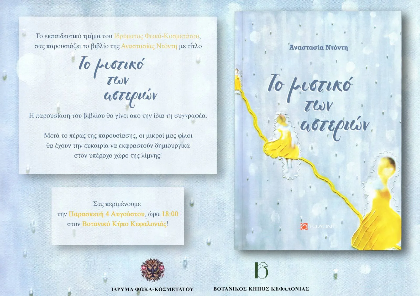 Τον Αύγουστο του 2023, το Εκπαιδευτικό Τμήμα του Ιδρύματος Φωκά-Κοσμετάτου διοργάνωσε την παρουσίαση του βιβλίου της Αναστασίας Ντόντη «Το Μυστικό των Αστεριών» στη μαγευτική λίμνη του Βοτανικού Κήπου Κεφαλονιάς.