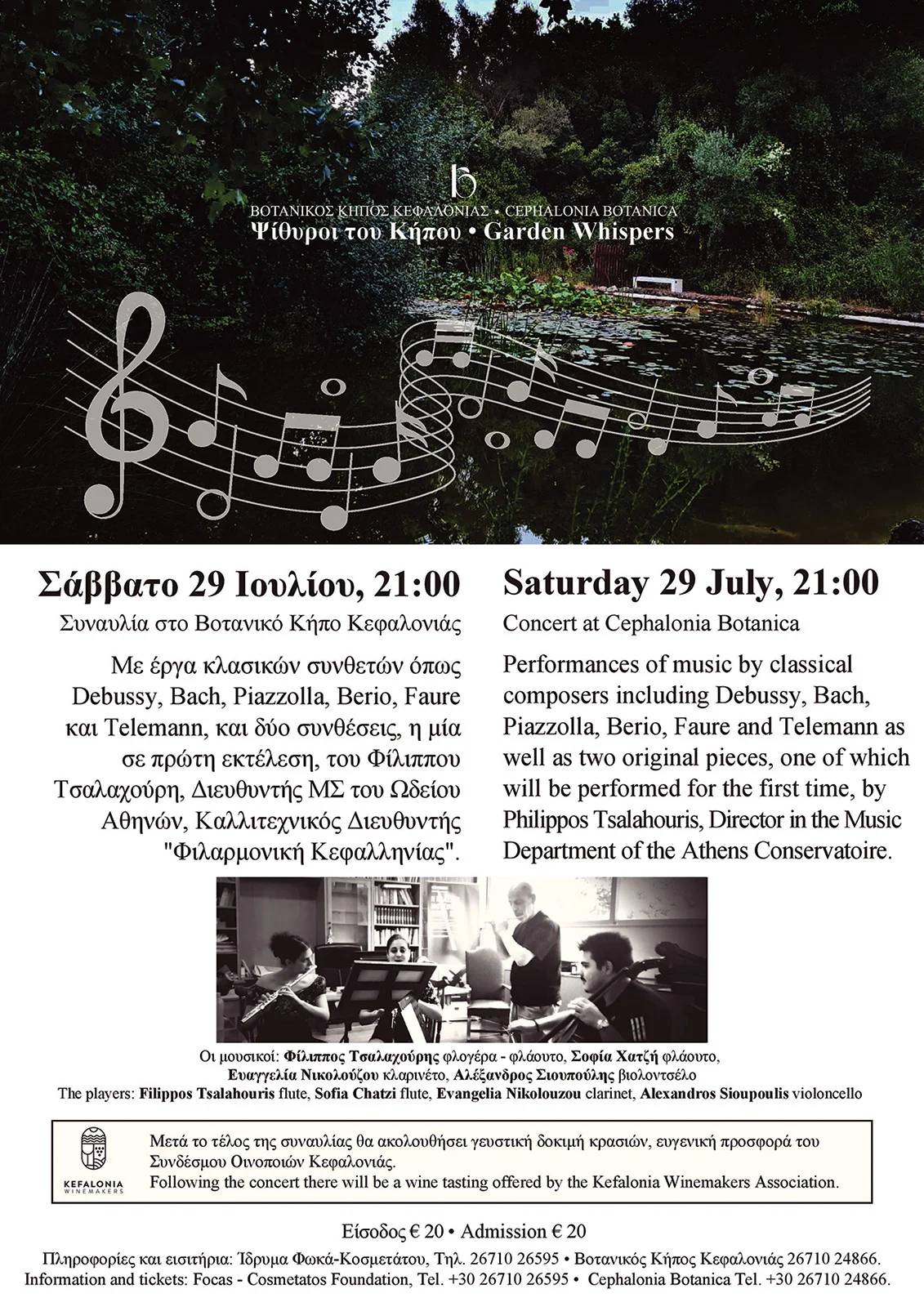 Το πρόγραμμα περιλάμβανε έργα των J.S. Bach, G. Telemann, G. Fauré, C. Debussy, A. Piazzolla και L. Berio, ενώ ο Τσαλαχούρης παρουσίασε δύο έργα του σε πρώτη εκτέλεση. Οι σολίστ ήταν οι Ευαγγελία Νικολούζου (κλαρινέτο), Σοφία Χατζή (φλάουτο), Αλέξανδρος Σιοπούλης (βιολοντσέλο), και ο Φίλιππος Τσαλαχούρης (φλάουτο). Στο τέλος της συναυλίας ακολούθησε γευστική δοκιμή κρασιών, προσφορά του Συνδέσμου Οινοποιών Κεφαλονιάς.