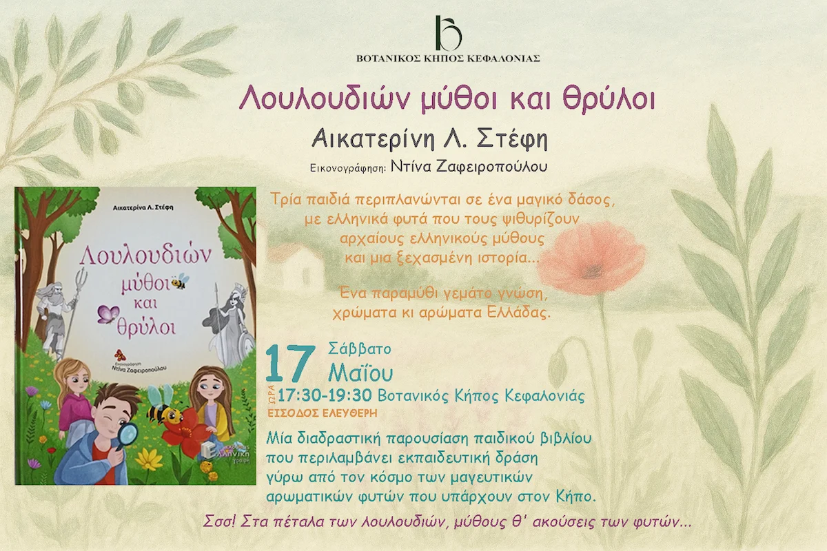 Κάτω από τις πανύψηλες λεύκες, με την ασημοπράσινη φυλλωσιά και τη γενναιόδωρη σκιά τους, δίπλα στη λίμνη με τα βατράχια και τα ολάνθιστα νούφαρα, τον Μάιο του 2025 μικροί και μεγάλοι έγιναν μια παρέα και, με τρόπο διασκεδαστικό και εκπαιδευτικό, συμμετείχαν στην παρουσίαση του παιδικού βιβλίου «Λουλουδιών Μύθοι και Θρύλοι» της Αικατερίνας Στέφη με εικονογράφηση της Ντίνας Ζαφειροπούλου.
