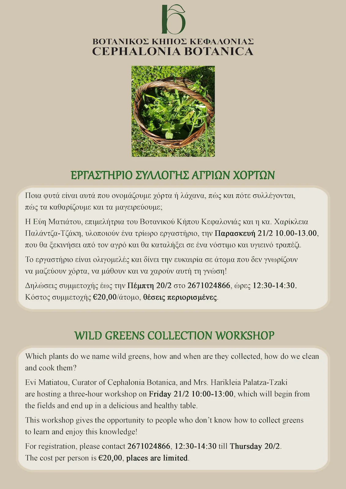 H γεωπόνος και επιμελήτρια του Κήπου Εύη Ματιάτου μαζί με την κα.Χαρίκλεια Παλάτζα-Τζάκη, έμπειρη συλλέκτρια, οργανώνουν τρίωρο βιωματικό εργαστήριο στον αγρό για την αναγνώριση των άγριων χόρτων, στη συνεχεία ακολουθεί το καθάρισμά και μαγείρεμά τους και ένα πολύ νόστιμο και υγιεινό γεύμα.