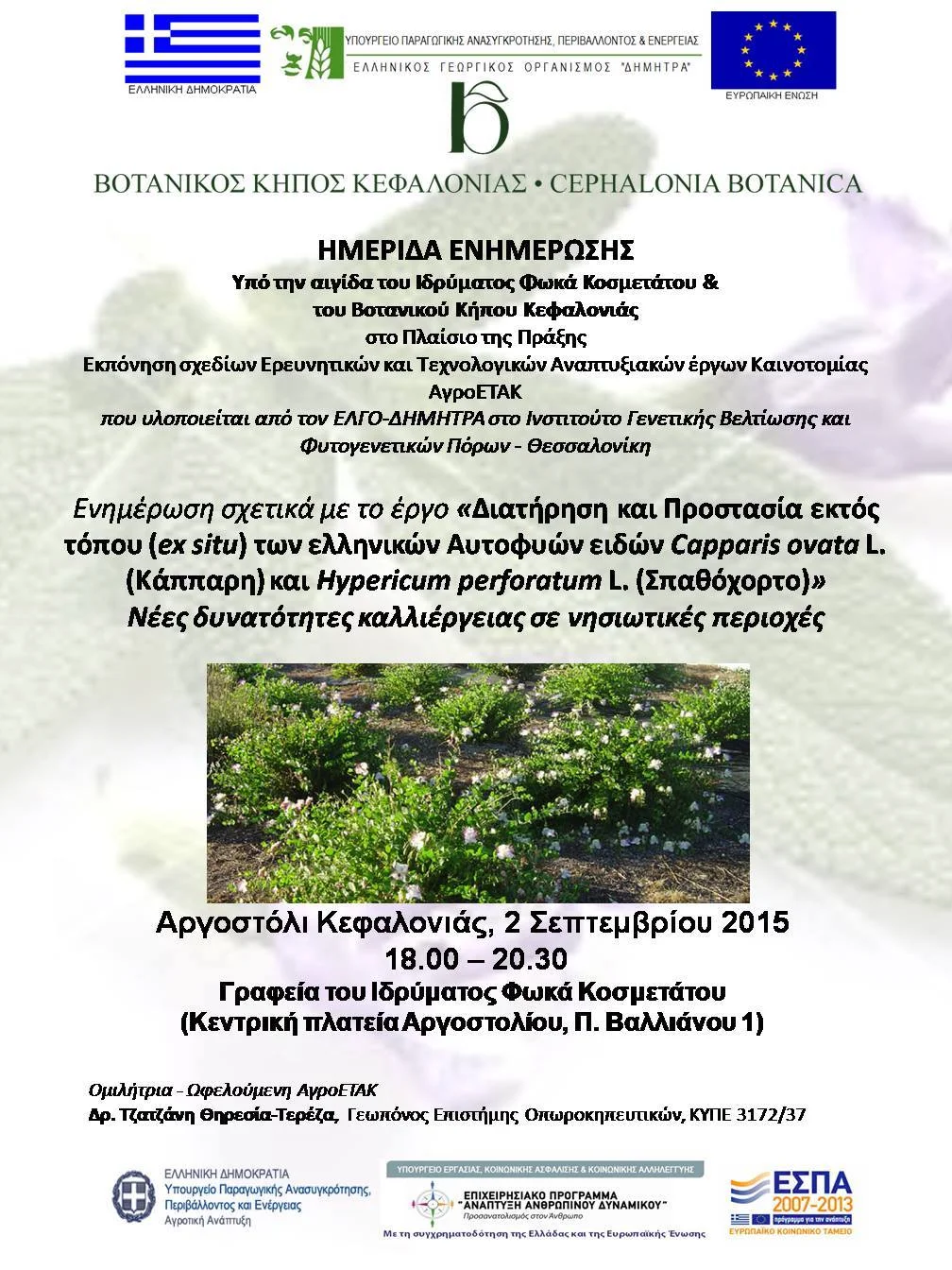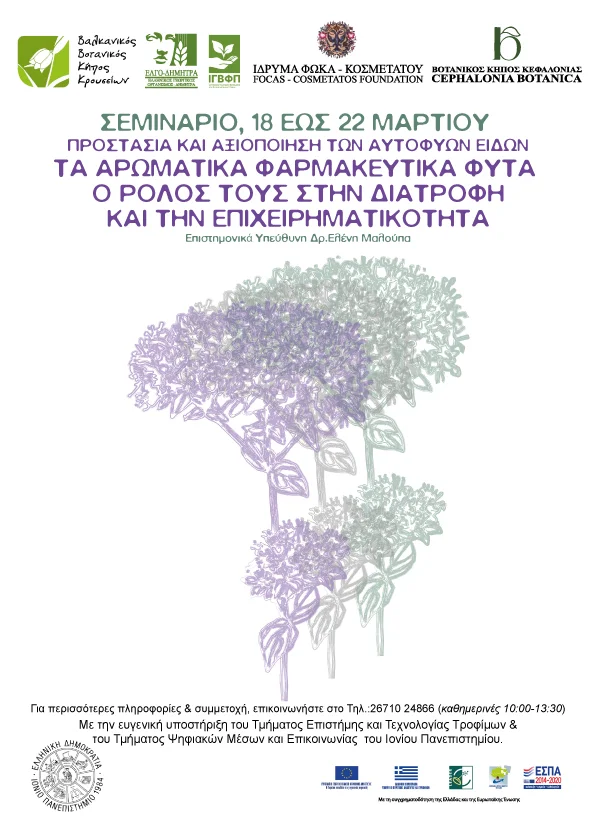 Ο Βοτανικός Κήπος Κεφαλονιάς και ο Βοτανικός Κήπος Κρουσσίων συνδιοργάνωσαν τον Μάρτιο του 2023 πενταήμερο σεμινάριο με θέμα «Αρωματικά και Φαρμακευτικά Φυτά». Επιστημονικά υπεύθυνη του σεμιναρίου ήταν η Δρ. Ελένη Μαλούπα, Διευθύντρια του Ινστιτούτου Γενετικής Βελτίωσης και Φυτογενετικών Πόρων του ΕΛΓΟ-ΔΗΜΗΤΡΑ, η οποία έγινε ευρέως γνωστή μέσω της επιτυχημένης εκπομπής της ΕΡΤ3 «Βότανα, Καρποί της Γης».
