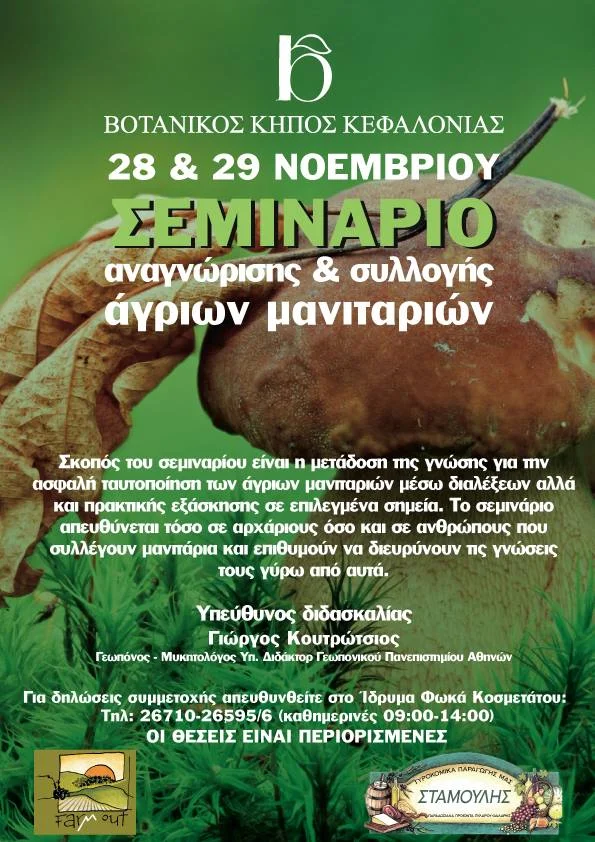 Διημέρο σεμινάριο με τον μυκητολόγο Δρ. Γεώργιο Κουτρώτσιο. Οι συμμετέχοντες την πρώτη ημέρα παρακολούθησαν το θεωρητικό μέρος σε αίθουσα που παραχωρήθηκε από το Τμήμα Τεχνολογίας Τροφίμων του Ιονίου Πανεπιστημίου, ενώ τη δεύτερη ημέρα ακολούθησε πρακτικό μέρος με ολοήμερη συλλογή σε ορεινά σημεία του νησιού.